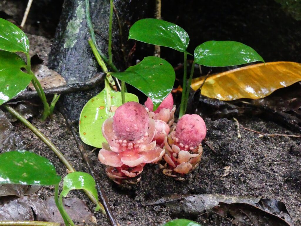 このピンクの花?が、リュウキュウツチトリモチ。森の小人と言われ、この季節は森の随所に顔を出しています。