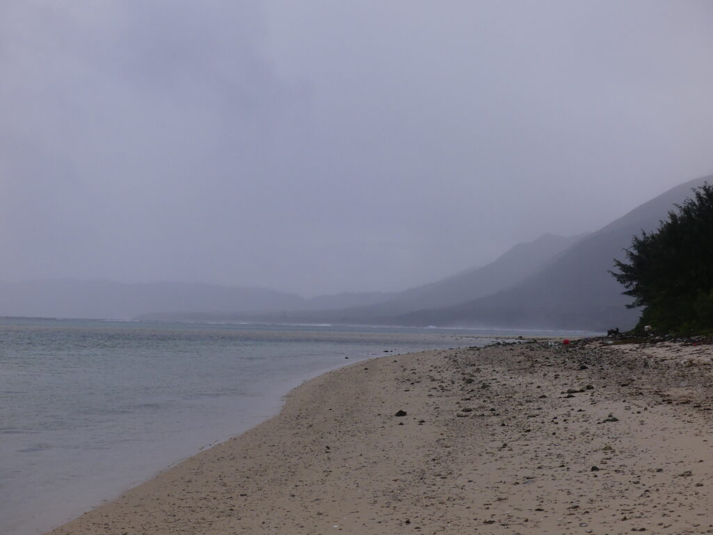 アダンの隙間を抜ければ海。森の中では気にならなかった雨が、海岸では風で吹き付けます。